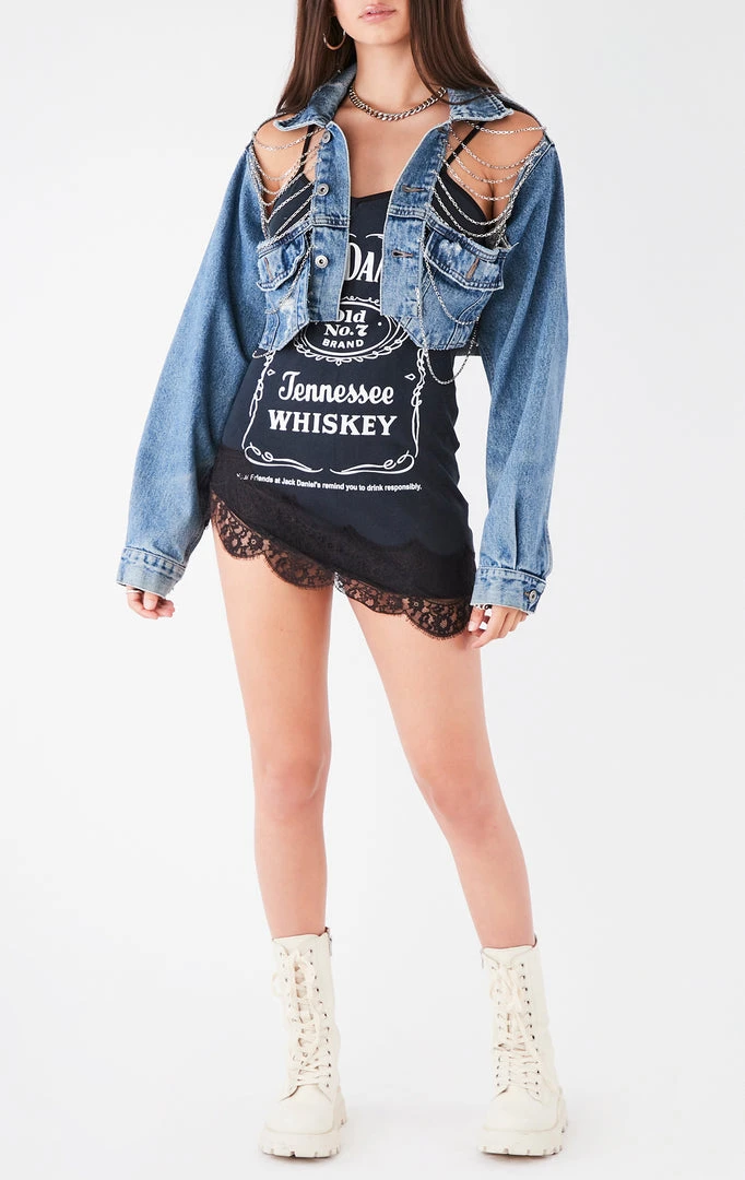 Furst of a Kind took an oversized vintage Jack Daniel’s tee and reworked it into a dress. This one-of-a-kind tank dress features lace trim at the hem.