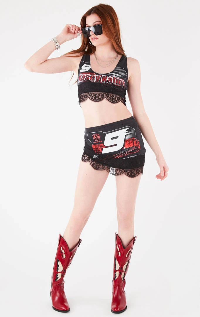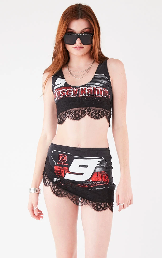 This vintage Nascar tee was upcycled by Furst of a Kind and reworked into a one-of-a-kind two piece set. This tank top and skirt set features lace trim.