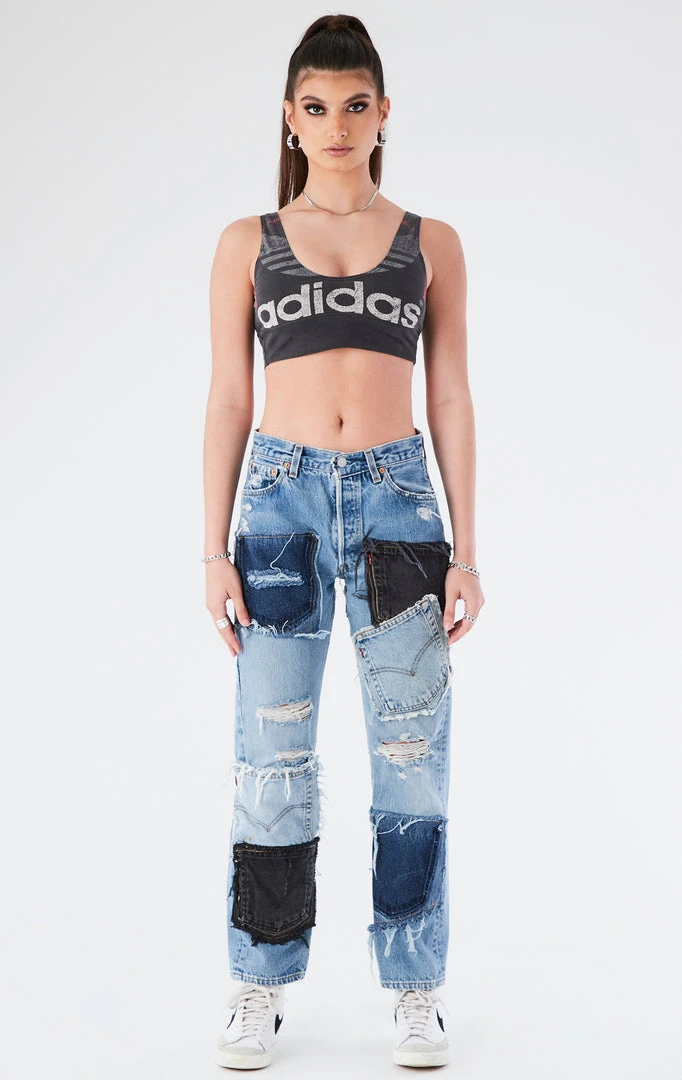 Furst of a Kind reworked this vintage denim jean by hand in Los Angeles, patch by patch. Featuring a relaxed fit, mid-rise with hand shredding. Upcycled from vintage Levi’s with totally unique denim patches across the front.