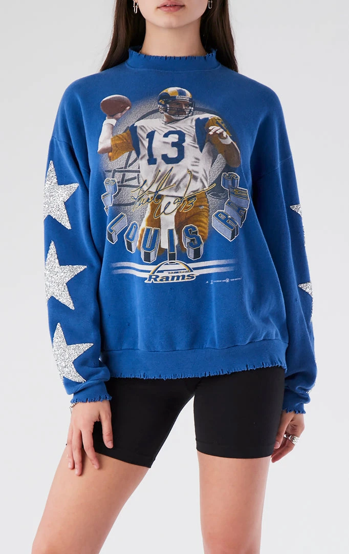 This Furst of a Kind reworked vintageĀ St. LouisĀ Rams sweatshirt is what dreams are made of. Silver rhinestone star patches adorn the sleeves or this handpicked vintage crewneck NFL sweatshirt.Ā