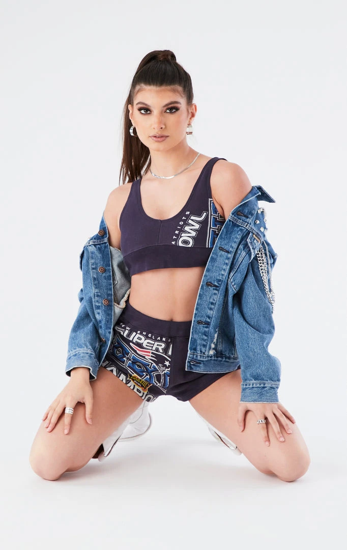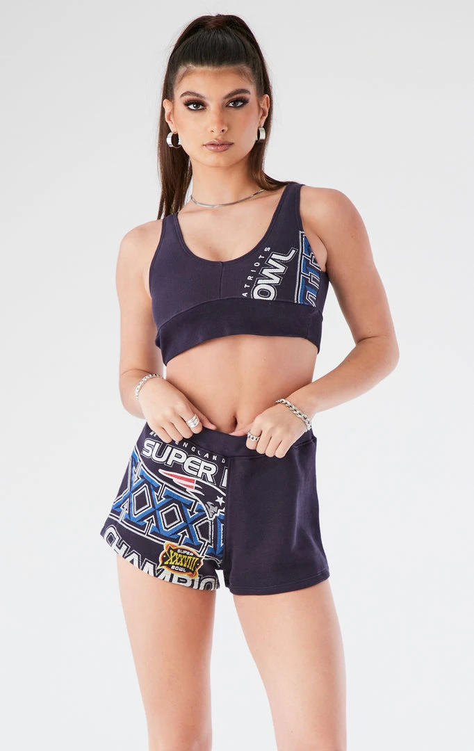 Furst of a Kind took two vintage pullover sweatshirts and spliced them together into this one-of-a-kind tank and short set. This New England Patriots set is sustainable and fashionable.Â