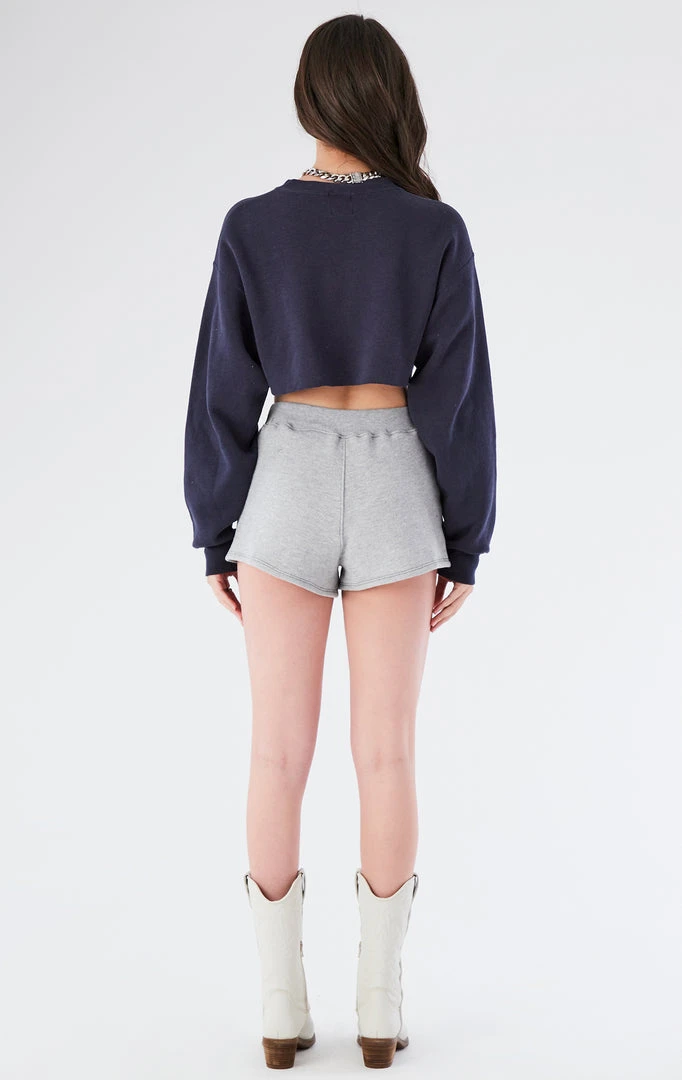 This one-of-a-kind set was reworked by Furst of a Kind from a vintage New England Patriots sweatshirt. Redesigned into a two piece set featuring a cropped sweatshirt paired with a spliced sweatshirt short.