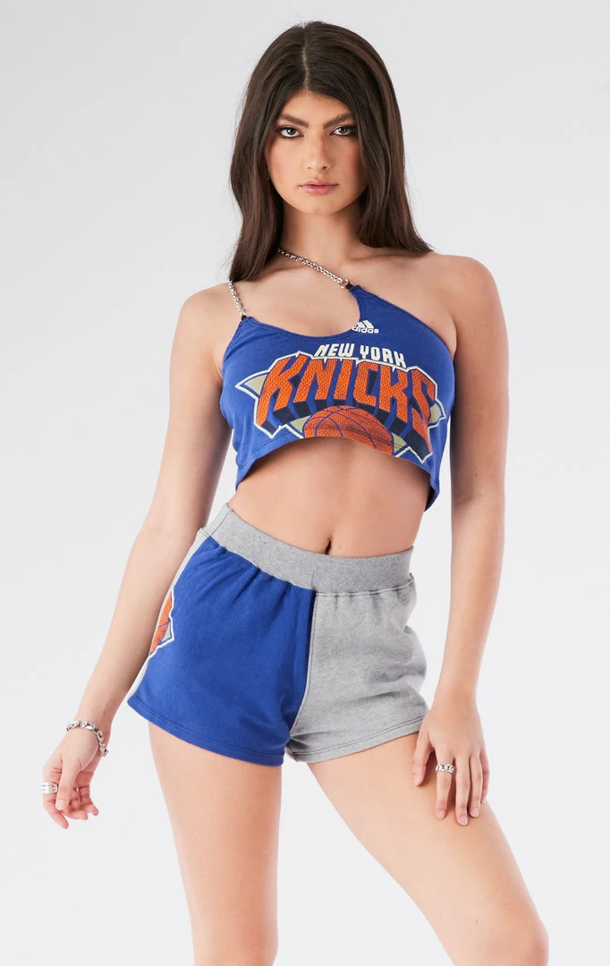 Furst of a Kind took a vintage New York Knicks tee and reworked it into a two-piece set. This set is complete with a one-shoulder double chain tank top and spliced shorts.