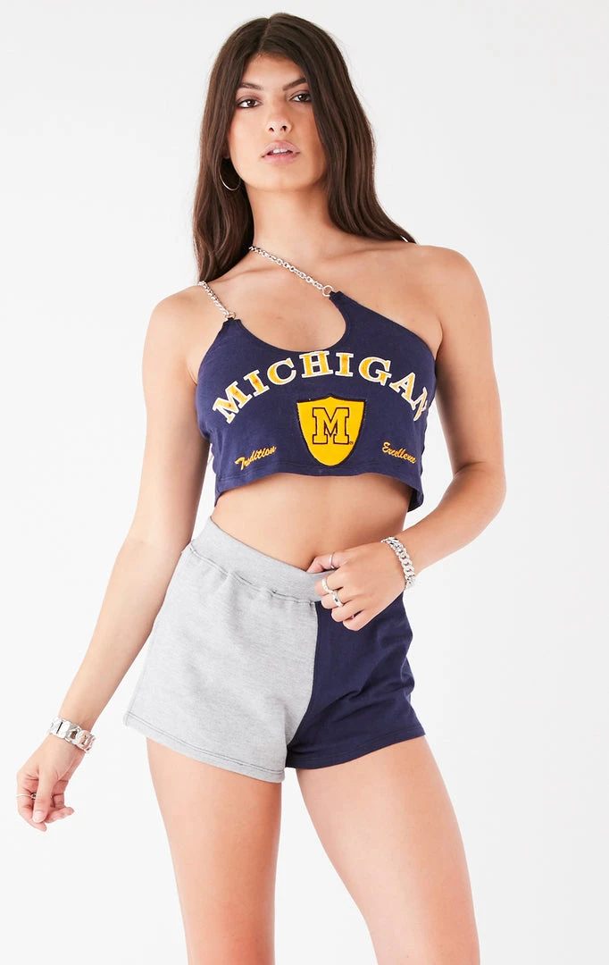 Furst of a Kind took a vintage University of Michigan tee and reworked it into a two-piece set. This set is complete with a one-shoulder double chain tank top and spliced shorts.