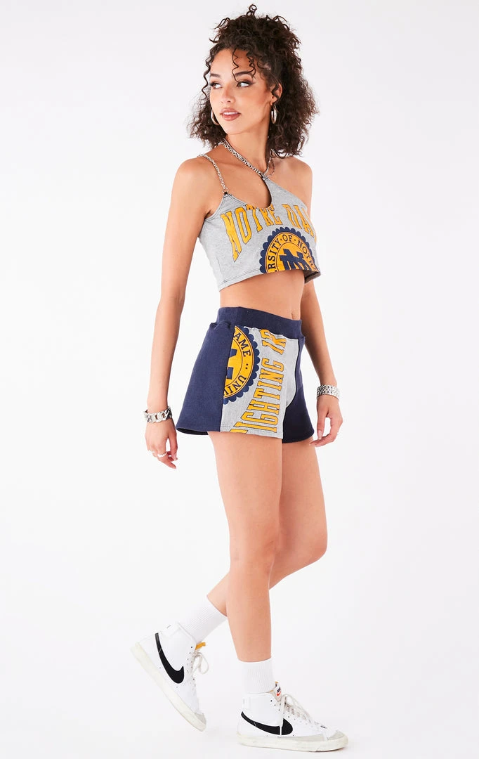 Furst of a Kind took a vintage University of Notre Dame tee and reworked it into a two-piece set. This set is complete with a one-shoulder double chain tank top and spliced shorts.