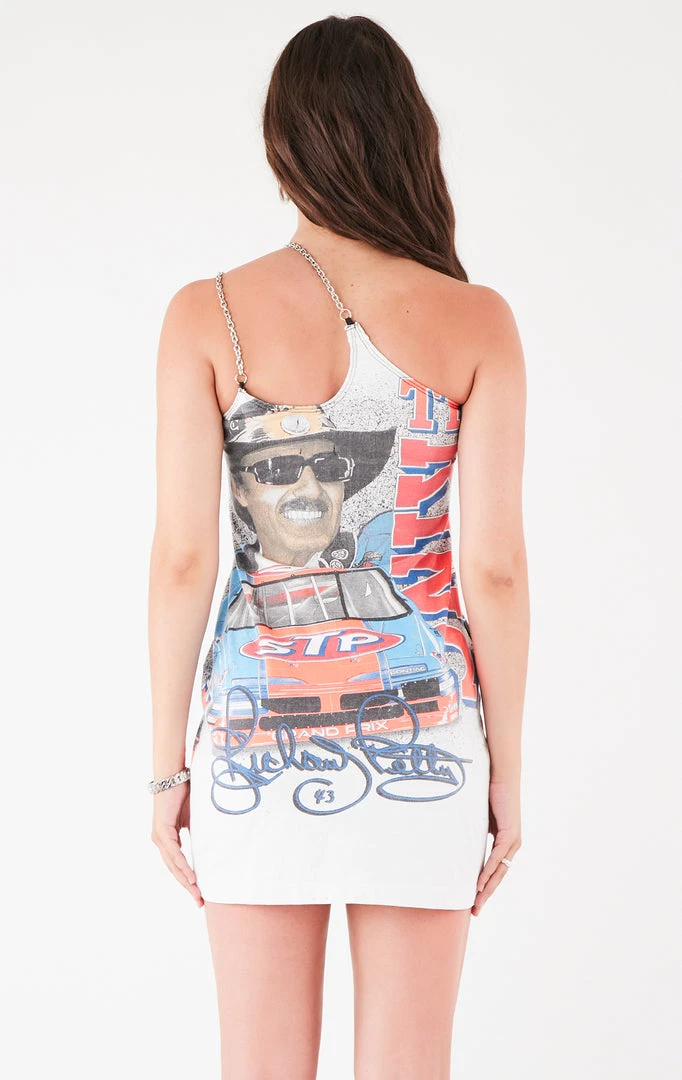 This one of a kind vintage Nascar tee was handpicked in the USA and reworked into a one shoulder dress. Furst of a Kind redesigned this piece by hand in Los Angeles with silver double chain detailing across one shoulder.