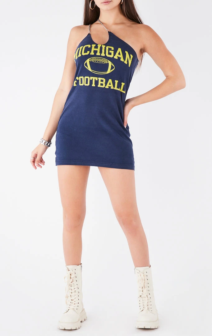This one of a kind vintage University of MichiganĀ tee was handpicked in the USA and reworked into a one shoulder dress. Furst of a Kind redesigned thisĀ pieceĀ by hand in Los Angeles with silver double chain detailing across one shoulder.