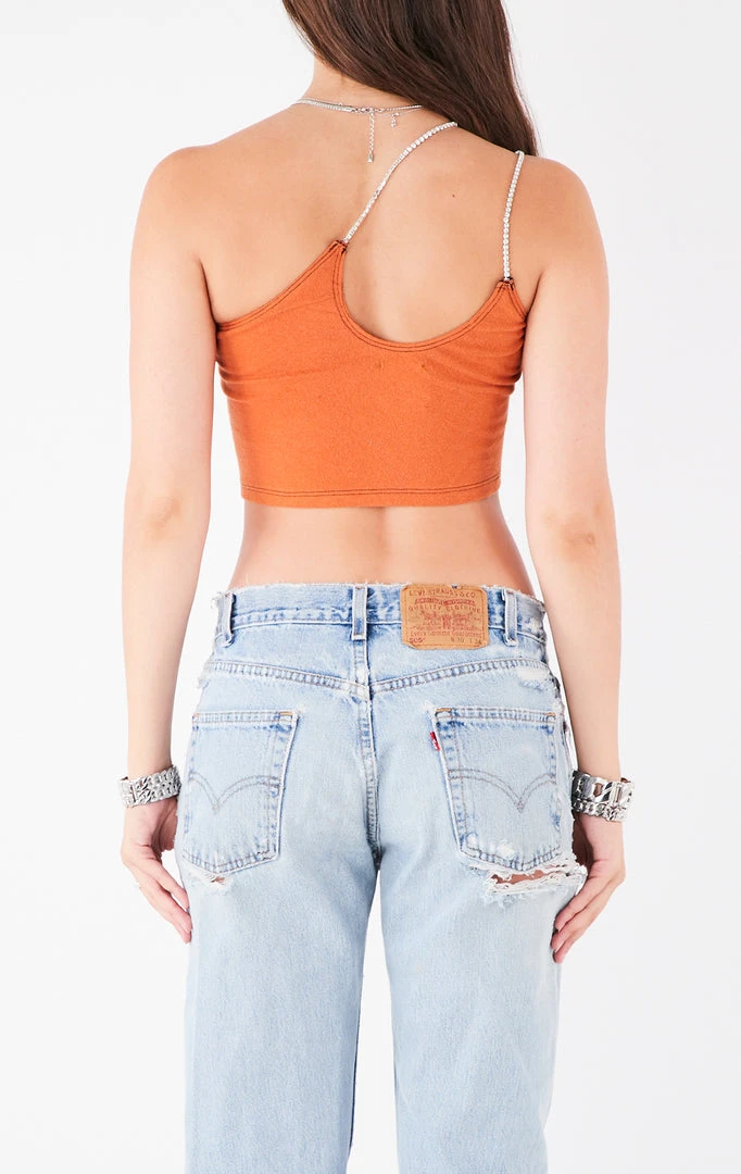 Furst of a Kind took this vintage University of Texas tee and reworked it into a priceless gem. This tank is complete with a one-shoulder cut out, cropped hem and double rhinestone chain straps.Â
