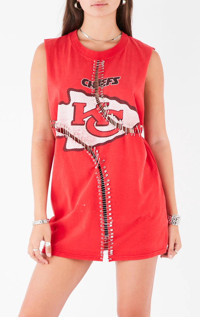 Furst of a Kind reworked this vintage Kansas City Chiefs tee. Features a dramatic sleeveless cut and curved ladder cutouts with safety pin detail.Â