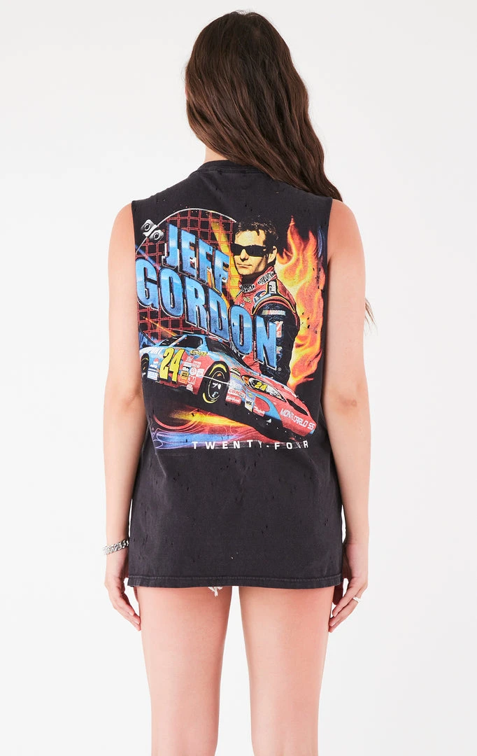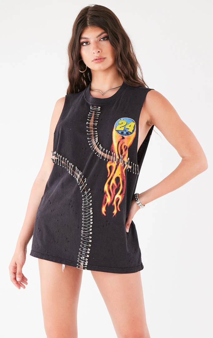 Furst of a Kind reworked this vintage Nascar tee. Features a dramatic sleeveless cut and curved ladder cutouts with safety pin detail.Â