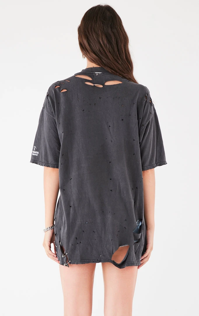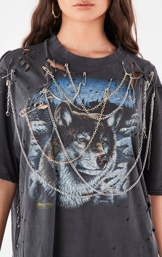 This one-a-kind vintage tee was reworked by Furst of a Kind. Features a ripped and stonewash technique, multi draped chains and safety pin detail.Â