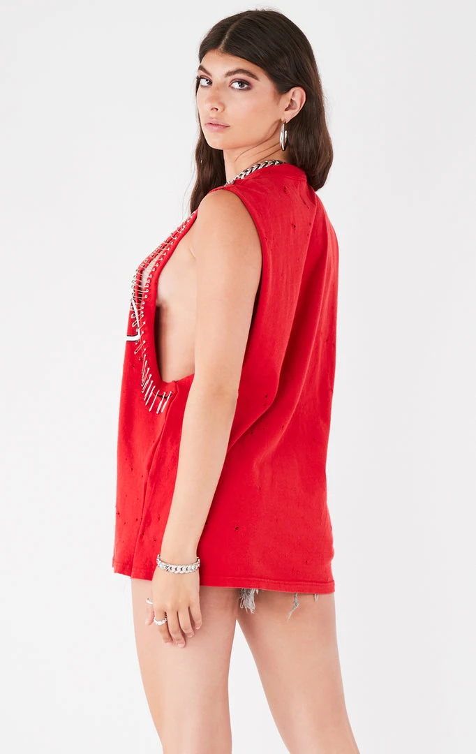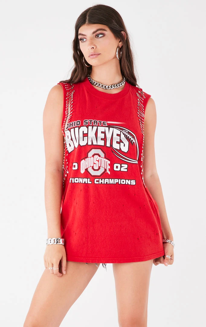 This vintage Ohio State University tee was sourced and reworked by Furst of a Kind in Los Angeles with a dramatic sleeveless cut and safety pin detailing.