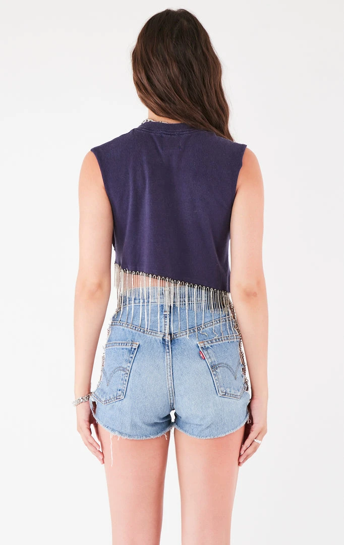 Furst of a Kind sourced this vintage Duke University tee and gave it an innovative upgrade. Features a stonewash technique, asymmetrical crop hem and rhinestone fringe detailing.Â