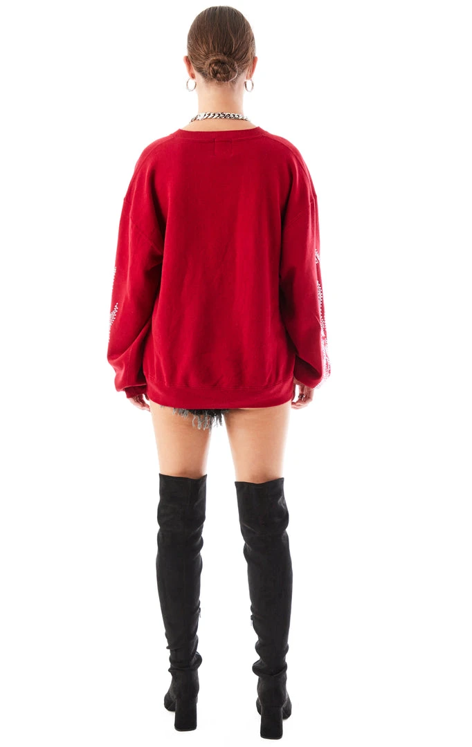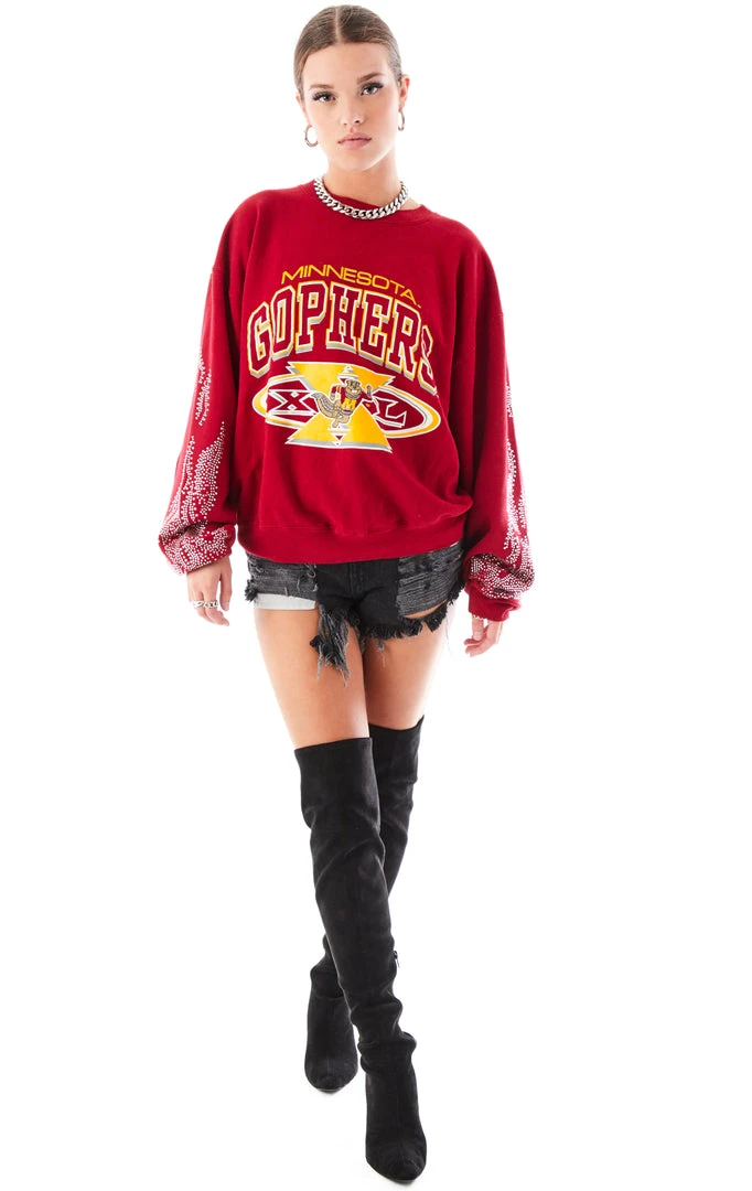 Straight FIRE. This vintage University of Minnesota sweatshirt is almost too hot to handle. Furst of a Kind reworked this college sweatshirt with silver rhinestone flame embellishment on both sleeves. The sickest sustainable addition to your vintage collection. That’s hot.Â