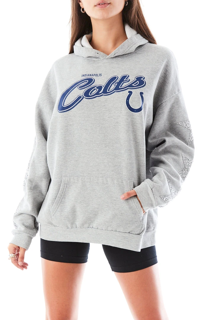 Twinkle, twinkle. This vintageĀ Indianapolis Colts hoodie was handpicked by Furst of a Kind to rework into a look that is SO LF. This one of a kind garment was finished off by hand withĀ silver rhinestone star patches along the sleeves.Ā