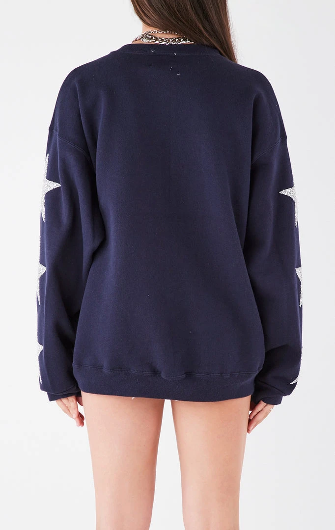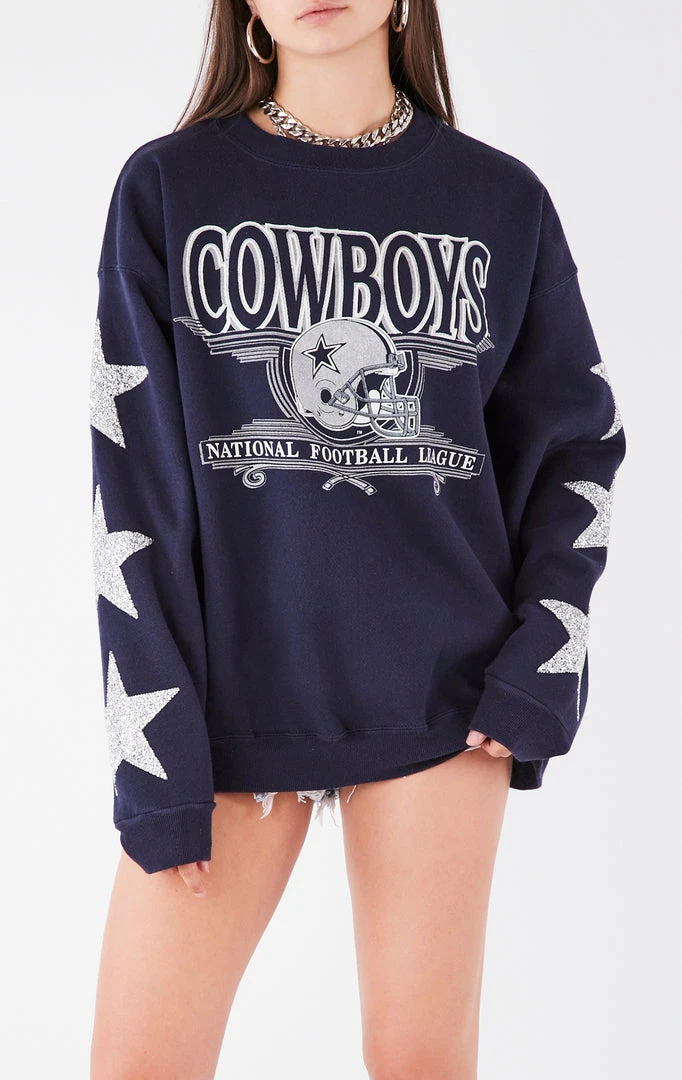 Upcycled from a vintageĀ Dallas Cowboys sweatshirt. Furst of a Kind reworked thisĀ NFL sweatshirt with silver star patch embellishment down both sleeves.Ā