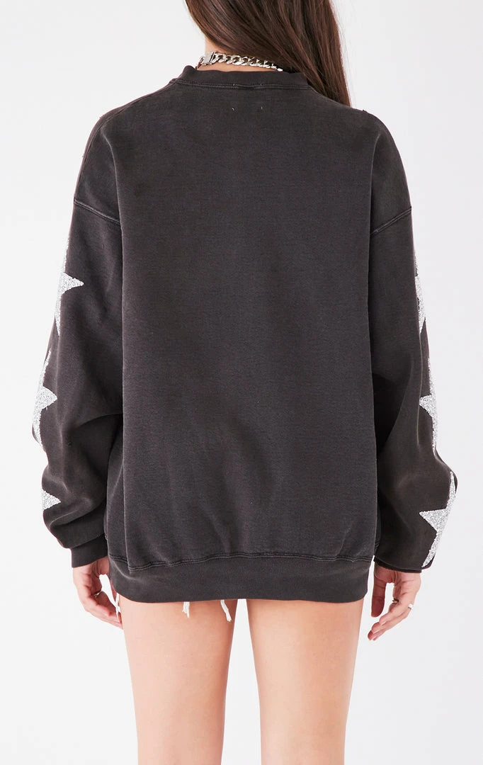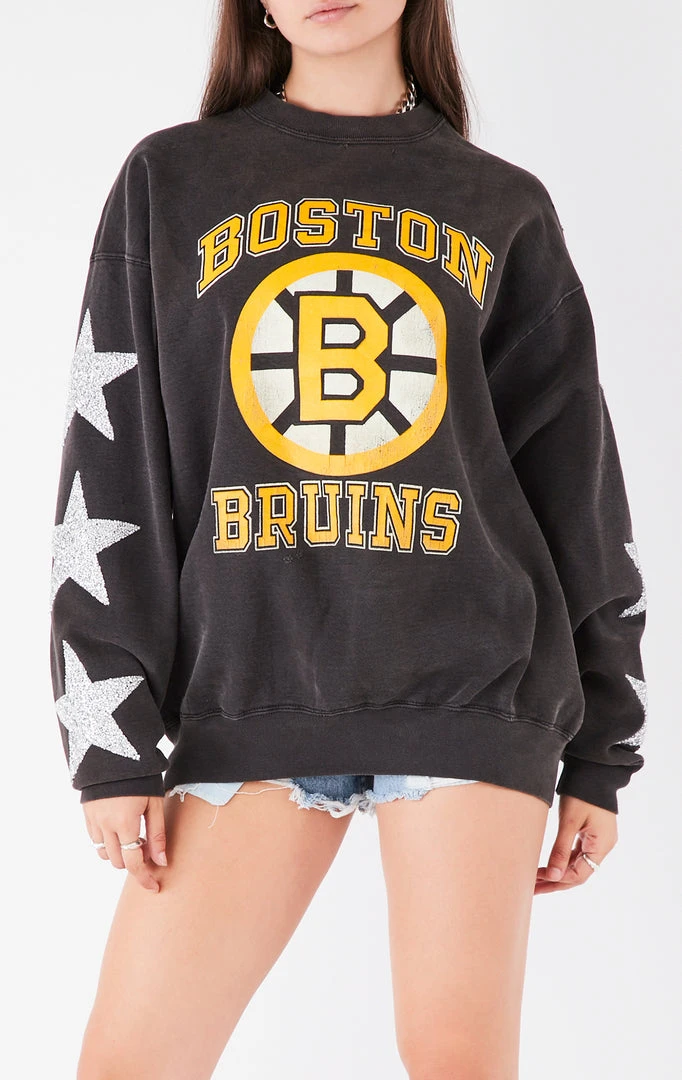 Upcycled from a vintage Boston Bruins sweatshirt. Furst of a Kind reworked this sweatshirt with silver star patch embellishment down both sleeves.