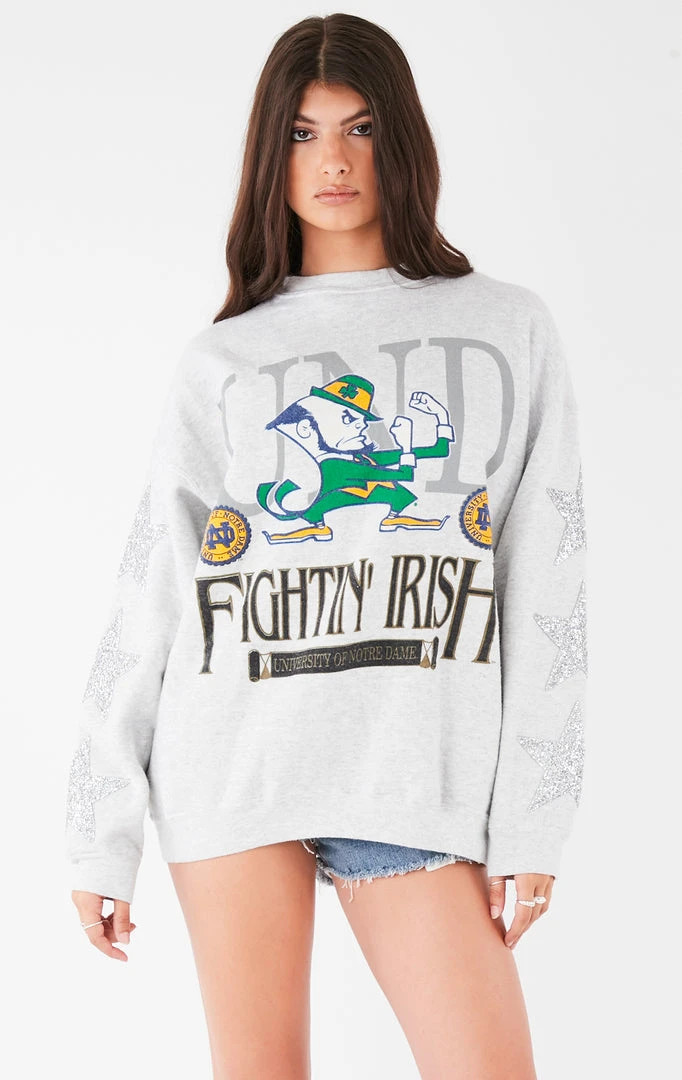 Upcycled from a vintage University of Notre Dame sweatshirt. Furst of a Kind reworked this college sweatshirt with silver star patch embellishment down both sleeves.Â