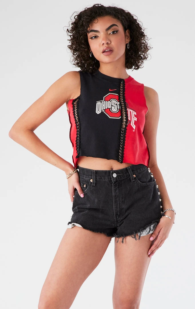 One-of-a-kind spliced chain sleeveless tee from Furst of a kind. Upcycled from two vintage Ohio State University tees spliced together with chain trim.