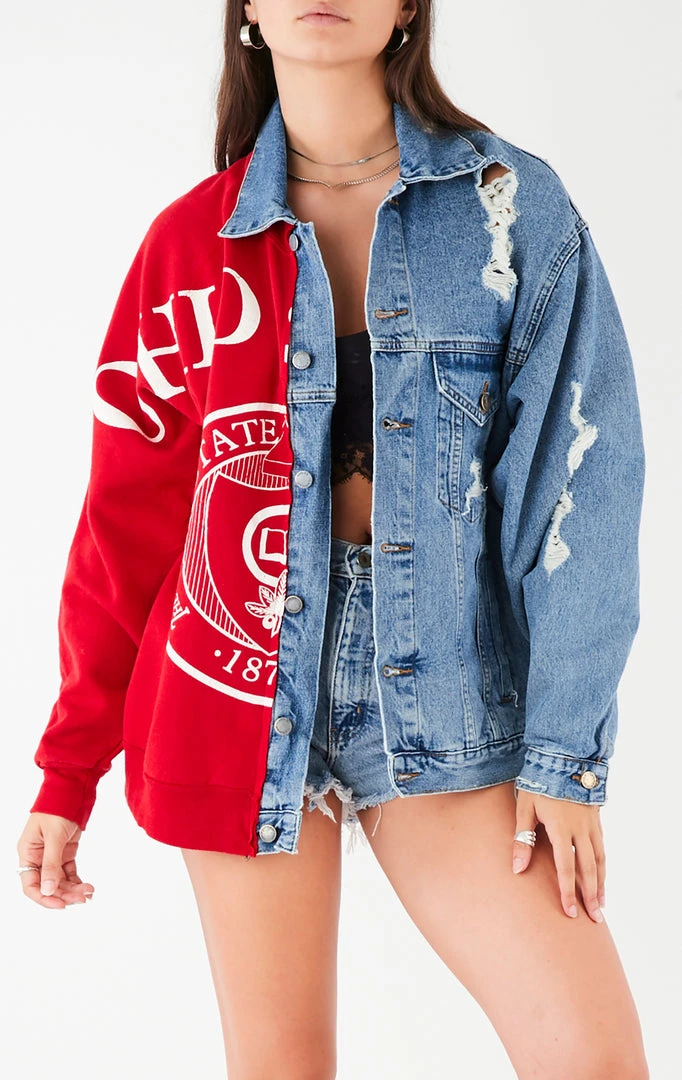 We are OBSESSED with the oversized fit of this reworked denim jacket by Furst of a Kind. Featuring a hand spliced technique pairing a vintage Ohio State University sweatshirt with a repurposed blue distressed denim jacket. It’s the best of both worlds.