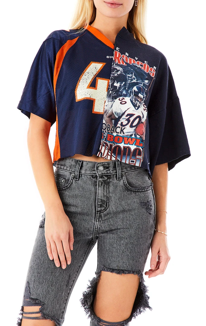 Talk about a perfect pair. Furst of a Kind spliced together a vintage Denver Broncos football jersey & sweatshirt to create this iconic reworked look. The fit is oversized with a cropped cut for styling ease. You know what to do.Â