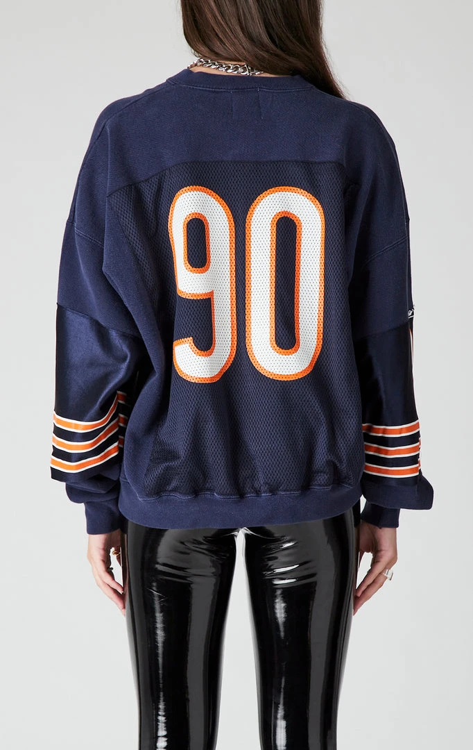 Furst of a Kind gives a whole new meaning to reworked vintage. Can we take a moment to appreciate the work here? Starting with a vintage Chicago Bears sweatshirt, the team spliced the sleeves from a vintage jersey into both arms. But wait, It doesn’t stop there. The back features a vintage jersey insert that really takes this piece over the edge for us. It isn’t a want, it’s a need.Â