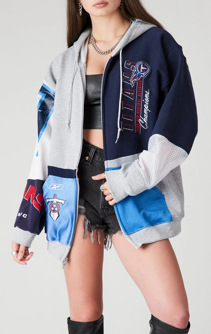 Step aside for this Furst of a Kind reworked sweatshirt. Hand sourced, sewn & spliced, this vintage Tennessee Titans patchwork zip up hoodie is the epitome of cool. Featuring assorted vintage graphic inserts throughout. Style on the street or in the stands, the choice is yours.