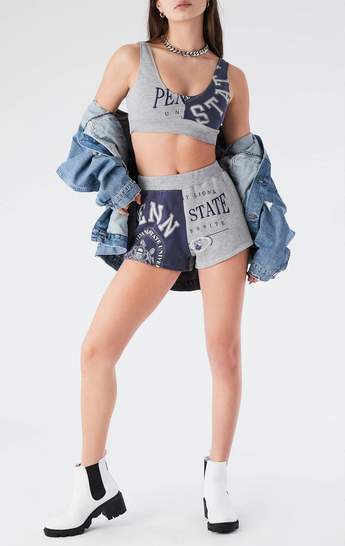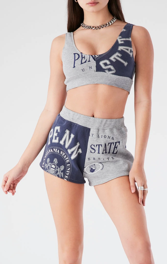Furst of a Kind took two vintage pullover sweatshirts and spliced them together into this one-of-a-kind tank and short set. This Penn State University set is sustainable and fashionable.