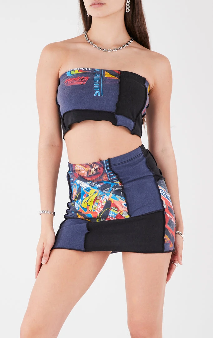 This one-of-a-kind set was crafted from vintage Nascar tee pieces sourced all over the USA. Furst of a Kind reworked them and spliced them together creating a two-piece set with a fit to flatter. Â
