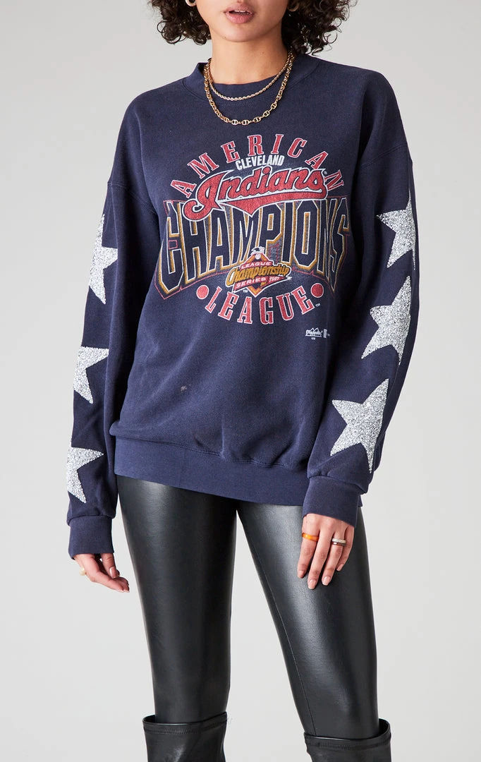 All star status. This Furst of a Kind reworked vintage Cleveland Indians sweatshirt is what dreams are made of. Silver rhinestone star patches adorn the sleeves of this handpicked vintage crewneck college sweatshirt. Starstruck? don’t be shy, add to cart.