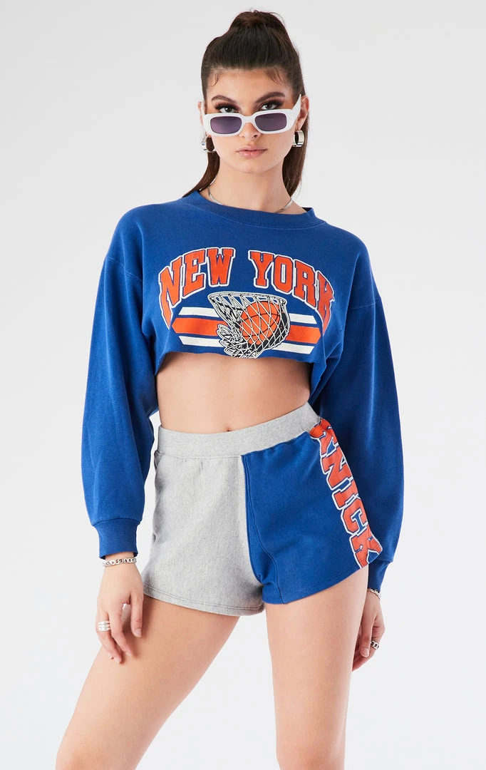 This one-of-a-kind set was reworked by Furst of a Kind from a vintage New York Knicks sweatshirt. Redesigned into a two piece set featuring a cropped sweatshirt paired with a spliced sweatshirt short.