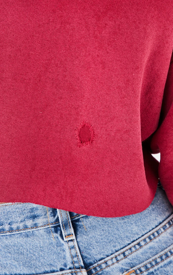 Upcycled from a vintage University of Alabama hoodie. Furst of a Kind reworked this vintage hooded sweatshirt with a cropped cut and silver star patch embellishment down both sleeves.Â