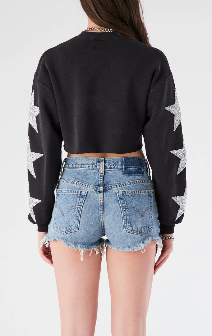 Upcycled from a vintage University of Colorado sweatshirt Furst of a Kind reworked this style with a cropped cut and silver star patch embellishment down both sleeves.