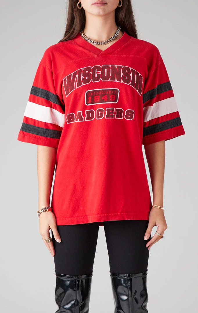 This vintage striped sleeve college tee features a University of Wisconsin graphic and original striped sleeves. Hand sourced by Furst of a Kind and kept just the way they found it to preserve that retro magic.