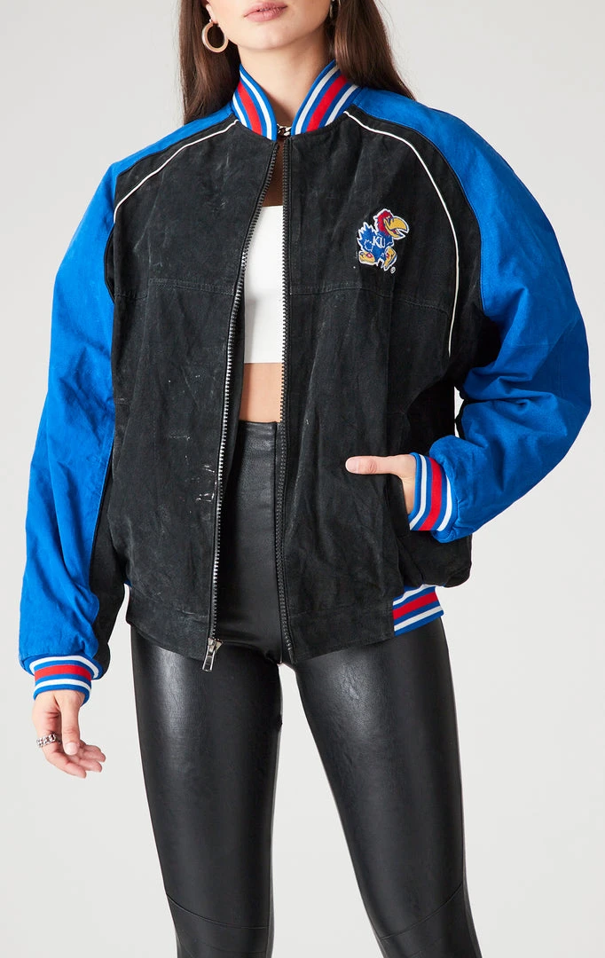 This Vintage suede University of Kansas jacket gives one of a kind a whole new meaning. The Furst of a Kind vintage team is constantly searching the U.S. for the best of the best in Vintage, and we’ve opened the archives for you. Featuring lettering and patches on front, back and sleeve, ribbed cuff & hem, and button closure. Collect now, thank us later.