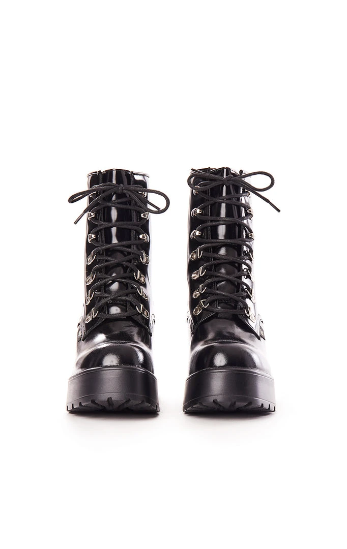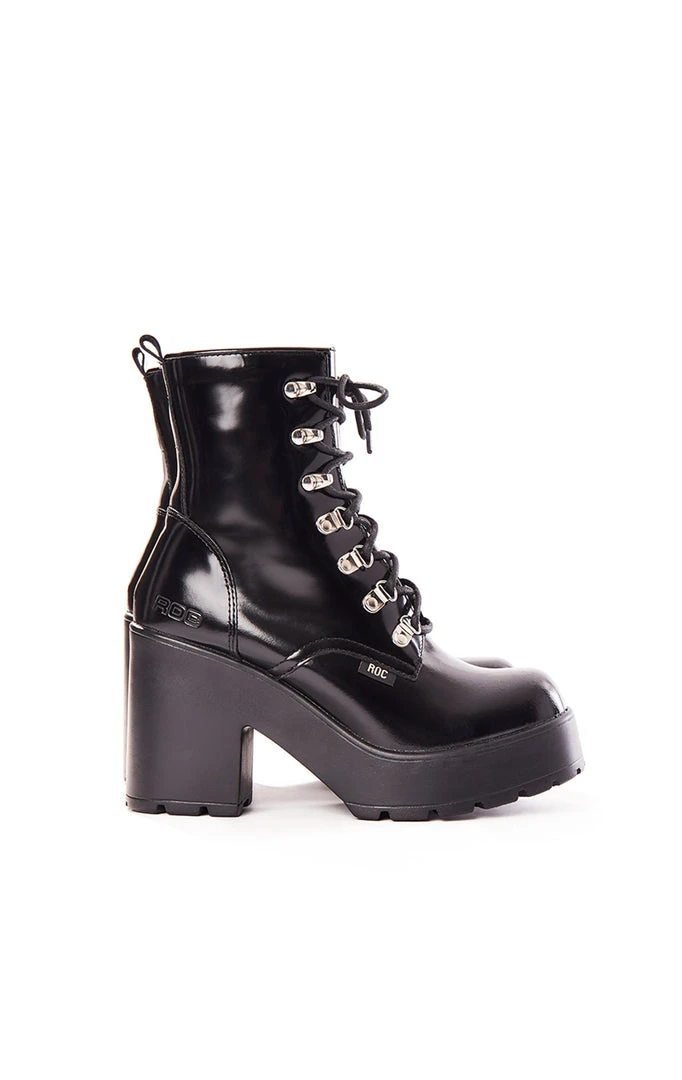 Mission Patent Leather Boots by ROC Boots Australia. Made from genuine hi-shine leather with silver rivets, these are the perfect boot to add some edge for stomping through the weekend.Â