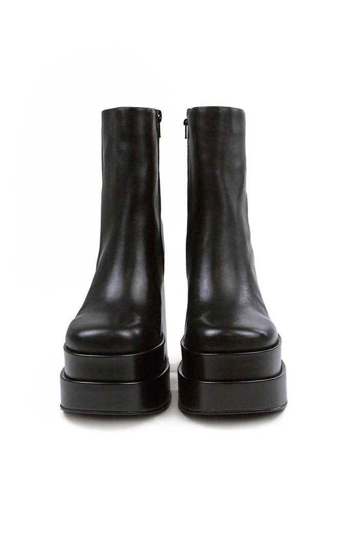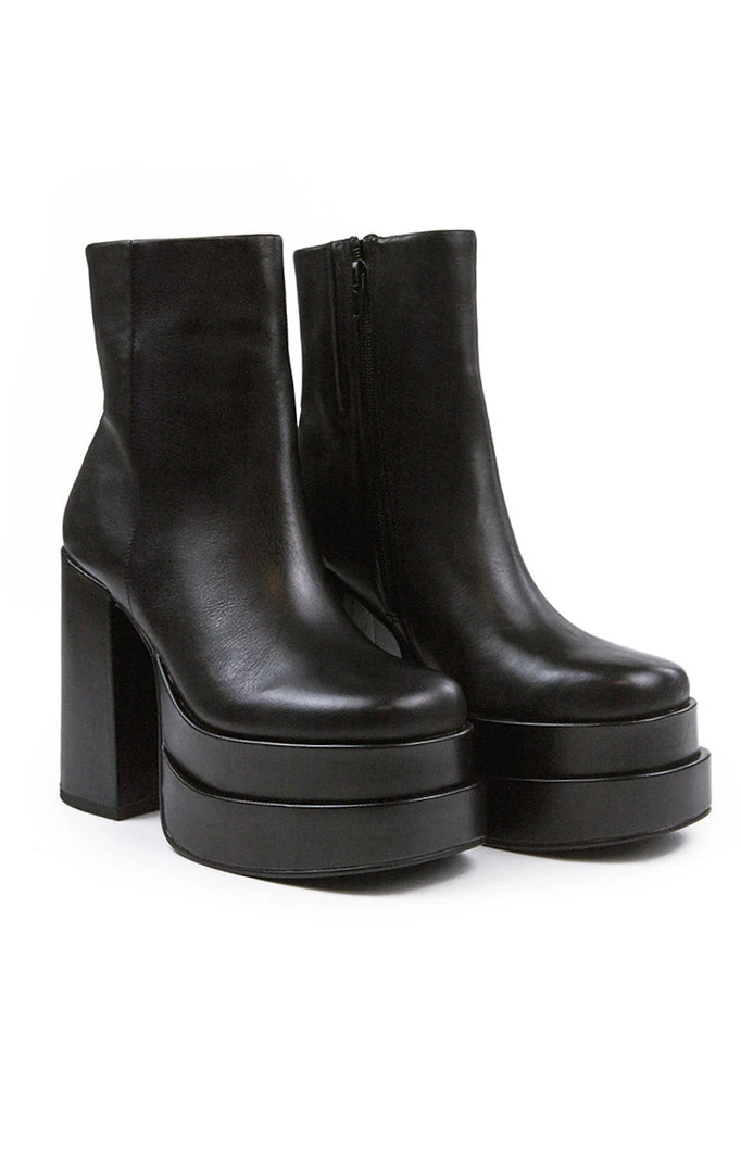 Cobra Platform Boot in Black Leather by Steve Madden. Features a double platform and a 5″ heel. If you are between sizes, size down a half size.Â
