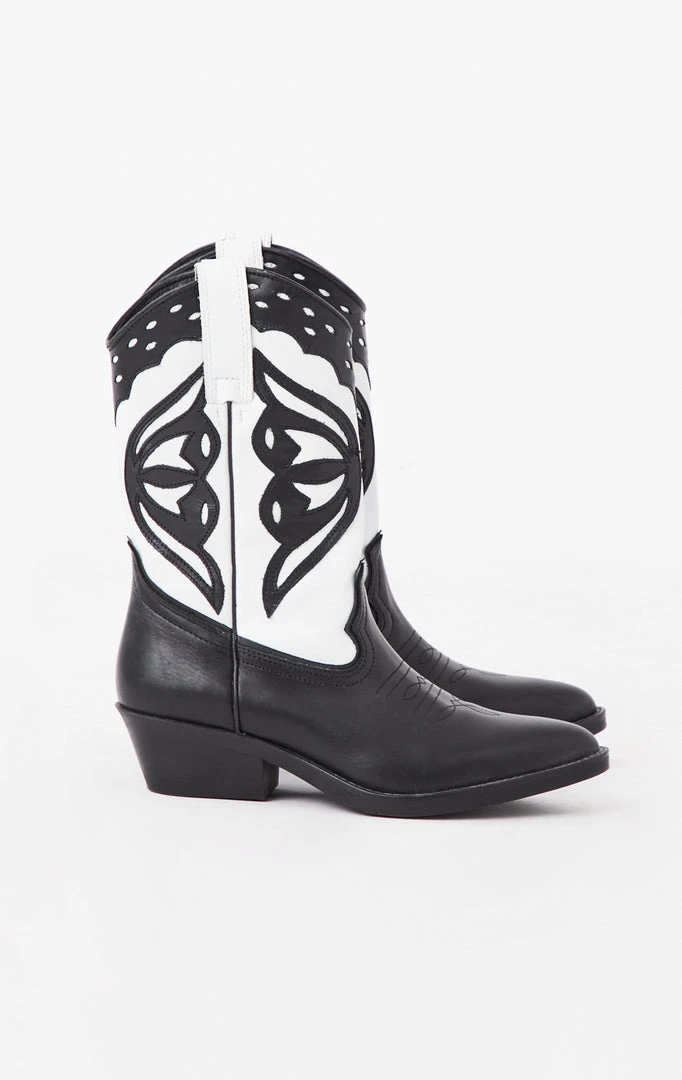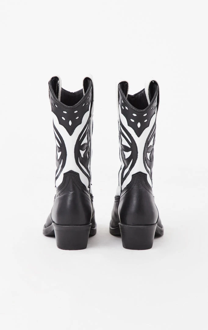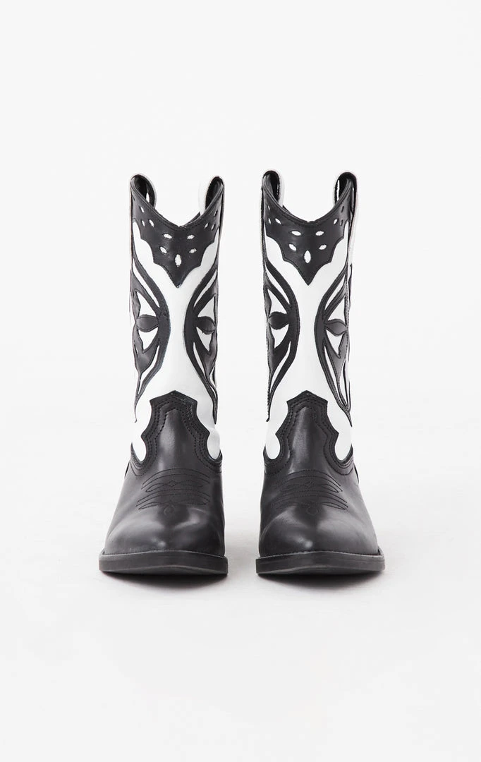 Laredo Western Inspired Boot in Black and White Leather by Steve Madden. Features a 1.75″ heel and rounded toe.