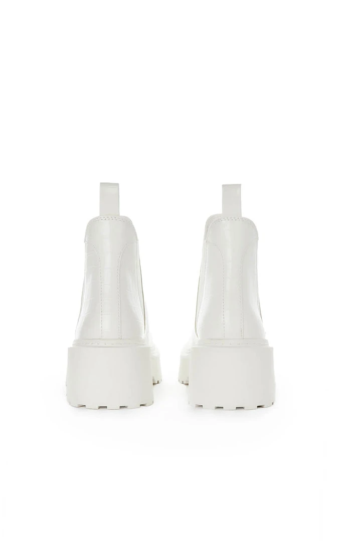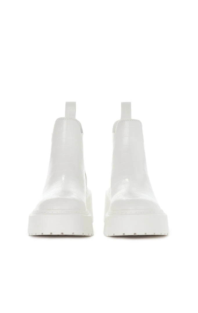 Steve Madden Shadow Crocodile Chelsea Boot in White. The white embossed crocodile elevates this elastic pull on style, making the Shadow your go-to boot this season.