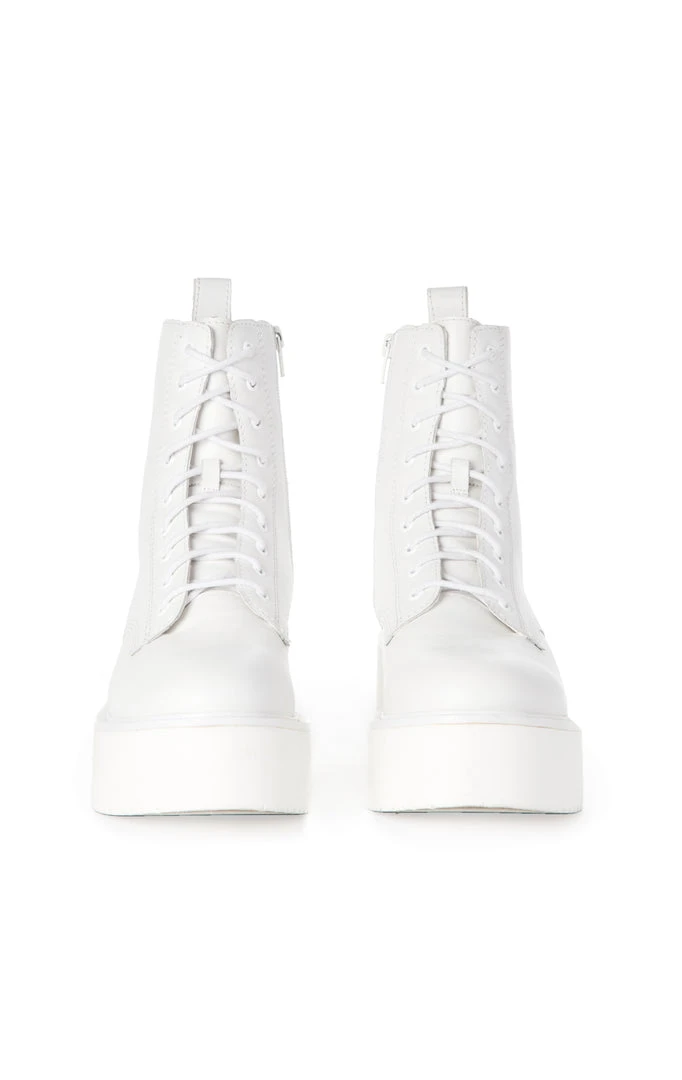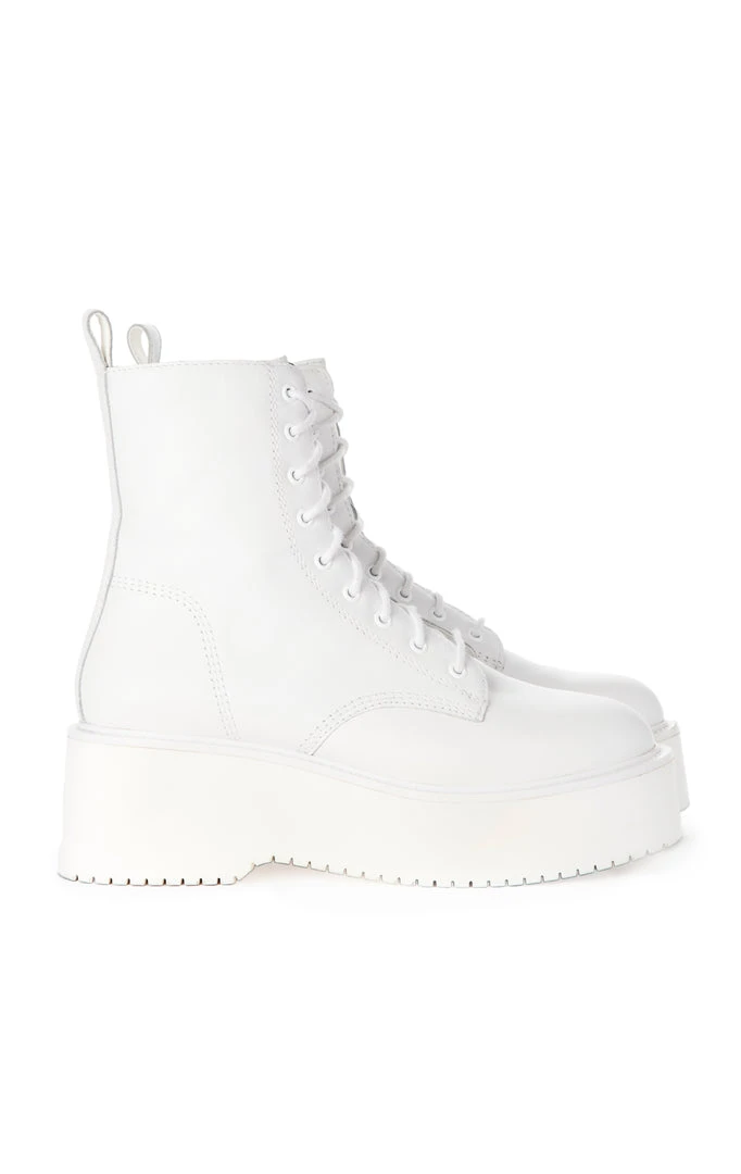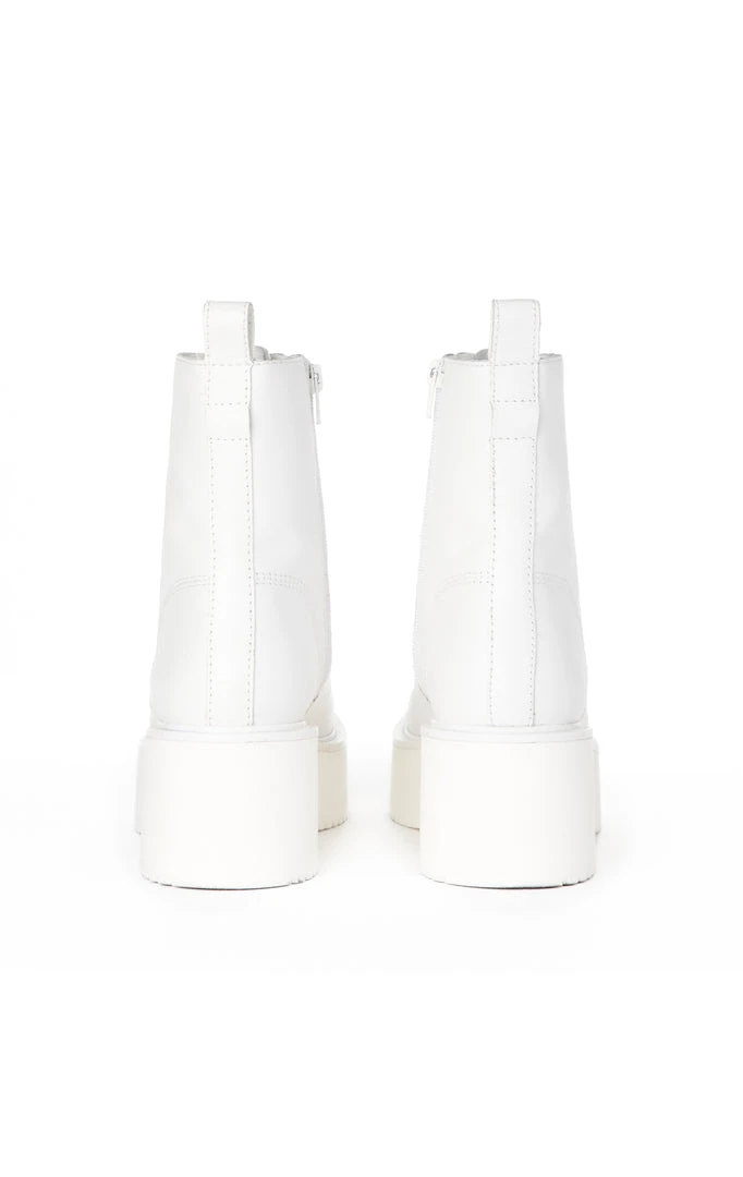 Steve Madden Twister Lace-up Boot in white. This chunky platform sole takes the classic combat boot to new heights. The inside zipper allows for easy pull on styling, but you won’t want to take these boots off.